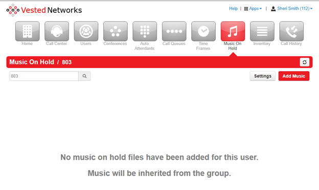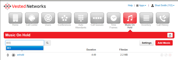 Once you click enter, your page will change a bit. It will be the same page but just changes to the Music On Hold for the particular extension. Now that you are on the music on hold page for Richmond CD, you will click the Settings button.
