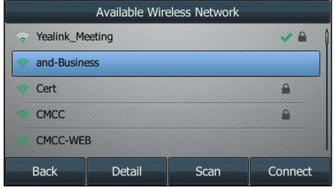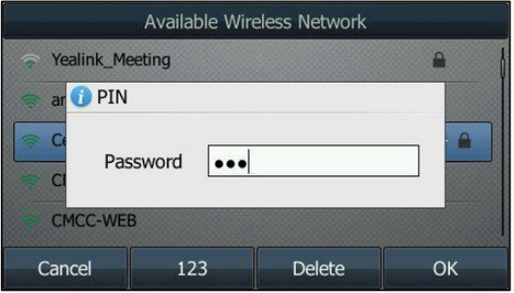 When Wi-Fi USB dongle WF40 is connected to the USB port at the back of the IP phone, the LCD screen will prompt “Wi-Fi adapter has been added, scanning the available wireless network right now?”. You can press the OK soft key to activate Wi-Fi mode directly and scan Wi-Fi devices automatically.