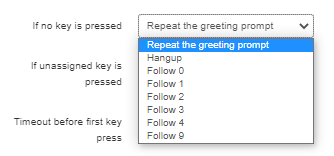 Choose what happens when an invalid key is pressed. Usually you will repeat the greeting endlessly, hang up, or forward to a speed dial or call queue.