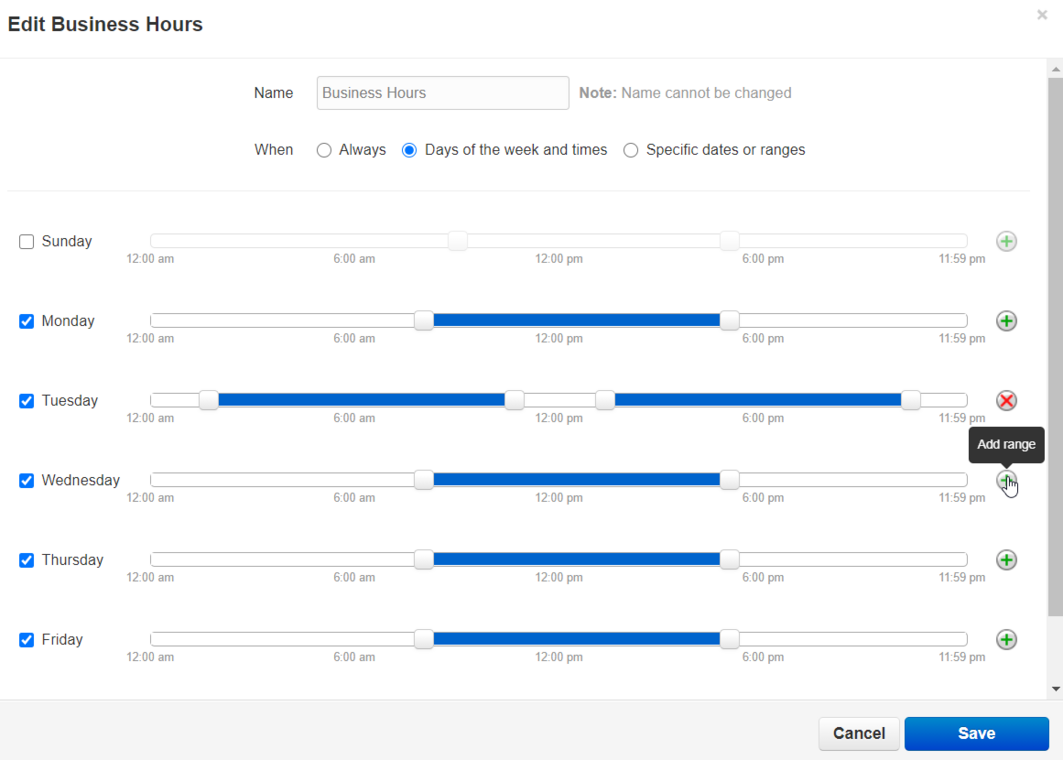 Click and drag the sliders to adjust the start and end time. You can also click the green + to add an additional time frame on the same day