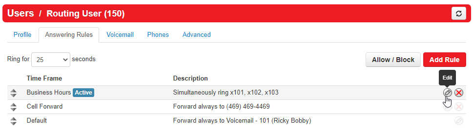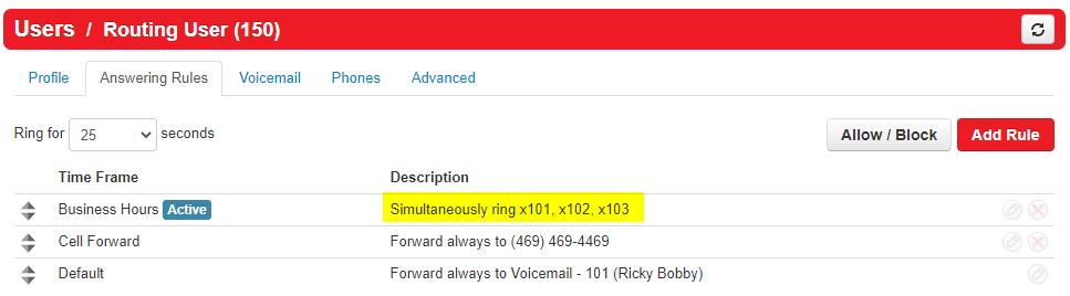 Click on Answering Rules and inside the routing user you should see the Business Hours time frame and then a list of extension numbers. These are the extensions set to ring when the call comes in