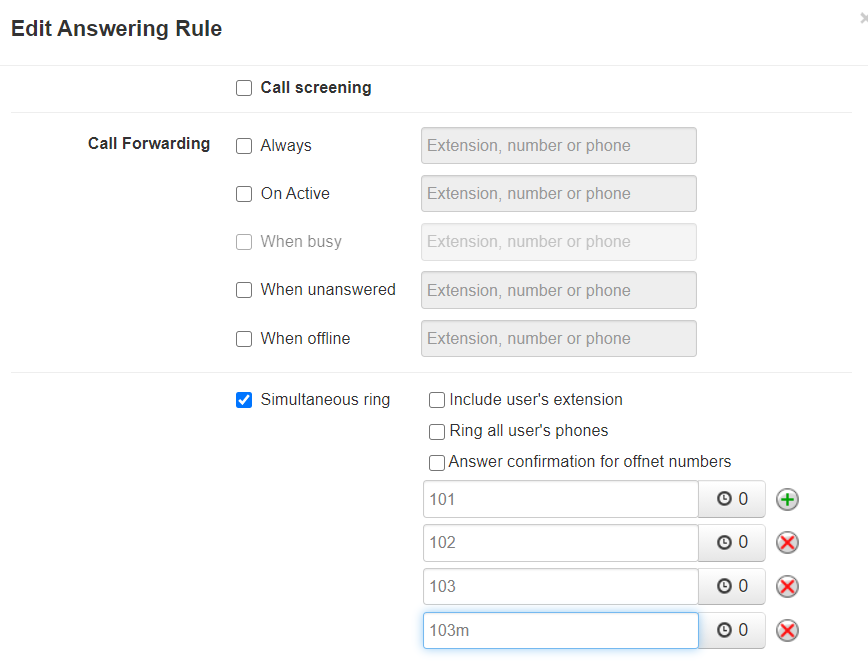 - When the timeframe is active, this will always forward incoming calls to the extension/number/phone that you specify. If a "user" is chosen as the destination, it will simultaneously ring all of their devices. If a "phone" extension is chosen, it will ring one specific device. Other options could include a voicemail box, a conference bridge, etc.