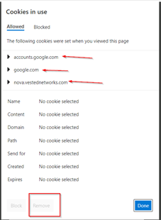 This will give you the following dialog box that show the cookies for this site. Click on the Remove button to remove all the cookies. When you clear out the cookies click on done.