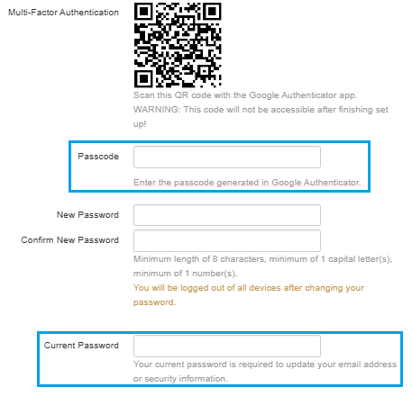 - Enter the passcode from your authenticator app into the Passcode field. (shown above in blue)