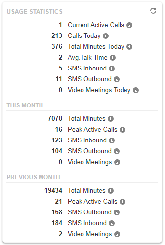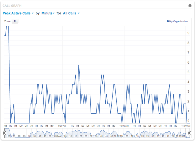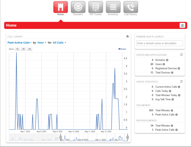 This part of the screen graphs to call usage across the domains on your platform. You can change the scope of what the graph displays by selecting the blue options at the top of the graph labeled "Peak Active Calls", "Hour", and "All Calls" and picking one of the options in each of the drop menus.