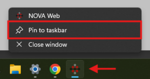 - Once installed, the NOVA Web app will open in its own window and appear on your taskbar. Right-click the icon and select “Pin to taskbar” for quick access in the future.