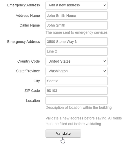 Caller Name: Remember, you are configuring the information that will be sent to 911 dispatchers in the event of an emergency. Since the device is located at your home, it is best practice to make the Caller Name be your full name. This will NOT effect your caller ID displayed when making calls to clients/customers