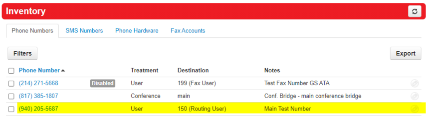 Now that we know their number and your number, click on the Inventory tab to find which of your users is assigned to the dialed number.