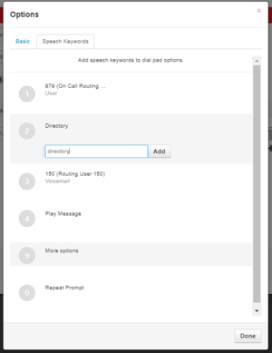 Speech Keywords allows the customer to speak a word and the system auto dials, like “support” or "directory."